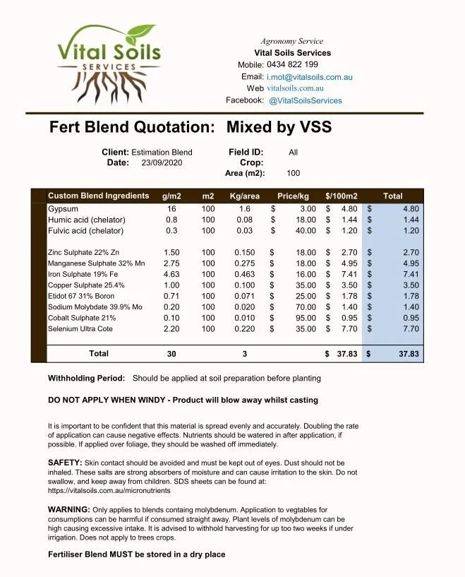 Vital Soils collaborates with numerous fertiliser blending companies across Australia to help growers source custom formulations. However, access to small-scale blending below the industry standard 1-tonne threshold is limited. This blending service is specifically designed to cater to market gardens, small orchards, home gardens, lawns, and farm trials, with no minimum order size and delivery available Australia-wide. Custom blending enables us to achieve higher performance in all our fertiliser programs while keeping it simple and convenient for farmers and gardeners.